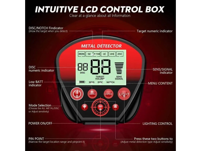 Acest dispozitiv este ideal pentru a cauta in mod eficient obiecte metalice, aur, argint, inclusiv monede, militaria, bijuterii sau alte lucruri valoroase ascunse in subteran. Detectorul este usor si versatil si foarte usor de utilizat. Daca detectorul detecteaza un obiect, acesta emite un sunet si cursorul din jurul numelui tinta se aprinde. De asemenea, afisajul LCD afiseaza intervalul tinta numerica, precum si puterea semnalului.