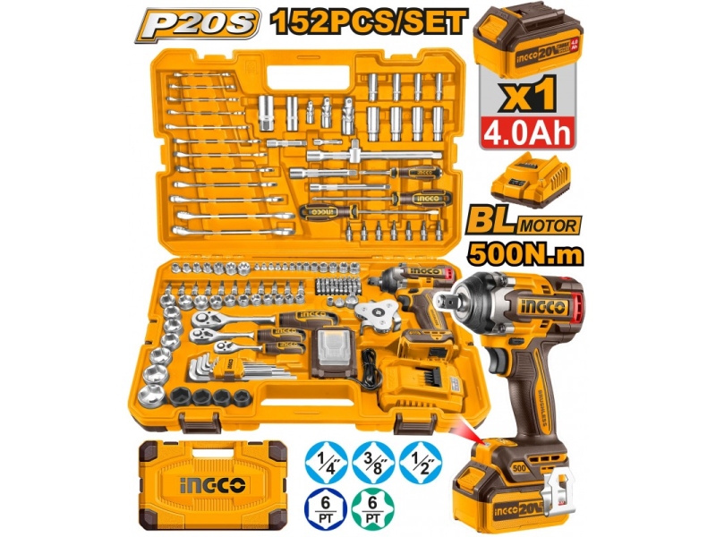 Acest set complet de 152 de piese este ideal pentru diverse lucrări de reparații și întreținere, fiind echipat cu o mașină de înșurubat cu acumulator de mare performanță, ce dispune de un cuplu de 650Nm pentru desfacerea rapidă a elementelor și de un cuplu de 500Nm pentru fixare. Mașina de înșurubat este dotată cu un motor fără perii (BLmotor) care asigură o viață lungă și o performanță constantă.