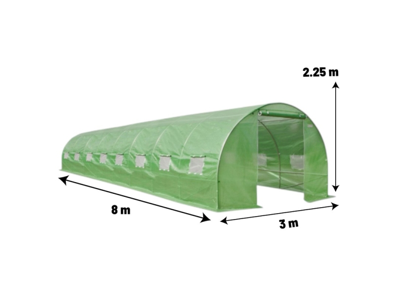 Pelicula armată de 200 g/m², creată sub formă de husă elastică și durabilă, permite păstrarea unui microclimat optim în interior, protejând plantele de frig, umiditate excesivă și radiații solare puternice. Cele două intrări și ferestrele laterale prevăzute cu plasă de aerisire îmbunătățesc circulația aerului și previn acumularea căldurii. Datorită dimensiunilor sale generoase de 8 m lungime, 3 m lățime și 2.25 m înălțime, sera oferă spațiu suficient pentru culturi diverse, inclusiv straturi înălțate, rânduri lungi sau ghivece. Este o alegere excelentă atât pentru grădini mici, cât și pentru gospodării și ferme familiale.