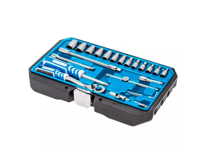 Set de capete tubulare si accesorii Hoegert HT1R416 46 buc. - set capete prize, biți de șurubelniță, accesorii 1/4". Prizele, biți și accesoriile sunt realizate din oțel aliat CrV de înaltă calitate. Rezistent la sarcini intense. Fabricat prin forjare. Clichetul cu 72 de dinți este realizat din oțel aliat CrMo, crescând durabilitatea mecanismului și precizia de funcționare.