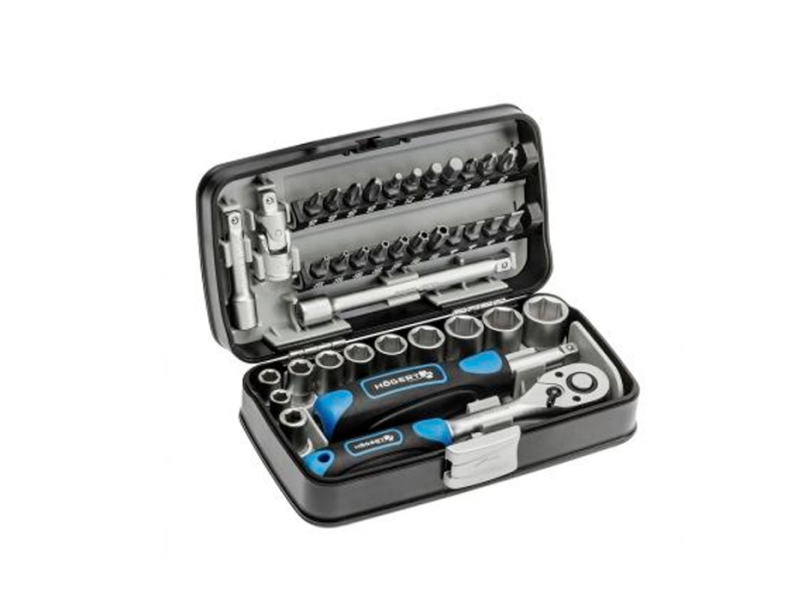 Set de capete tubulare si accesorii Hoegert HT1R462 38 buc. - set de prize, biți și accesorii 1/4". Soclurile și accesoriile sunt realizate din oțel crom-vanadiu aliat de înaltă calitate. Bitele sunt din oțel S2. Rezistente la sarcini intense. Fabricate prin forjare. Clichet cu 72 de dinți. Setul vine într-un carcasă din plastic cu bucle metalice.