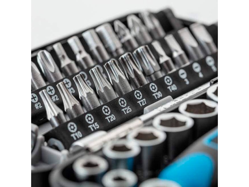 Biți de șurubelniță 1/4”: SL3, SL4, SL5, SL6 mm; PH1, PH2 x 2, PH3, PZ1, PZ2, PZ3; T10, TT15, TT20, TT25, TT27, TT30, TT40; H3, H4, H5, H6 mm. Șurubelniță pentru capete de 1/4". Clichet 1/4”. Prelungire 1/4” 50, 100 mm. Articulatie universala 1/4”. Adaptor pentru biți de 1/4".