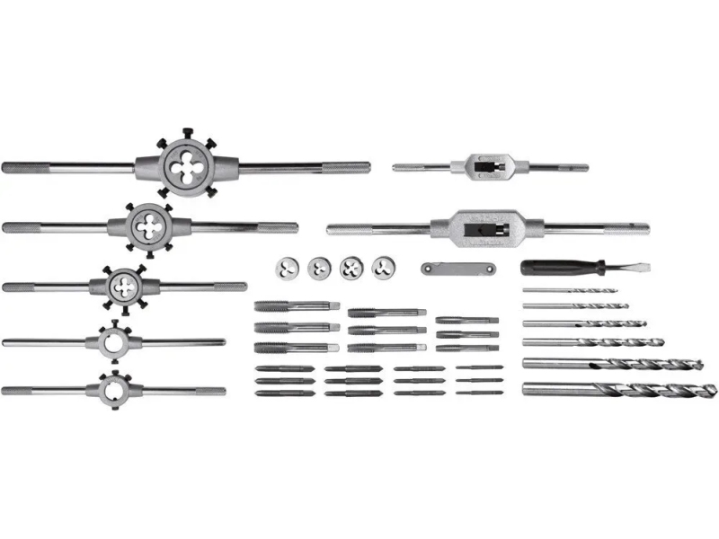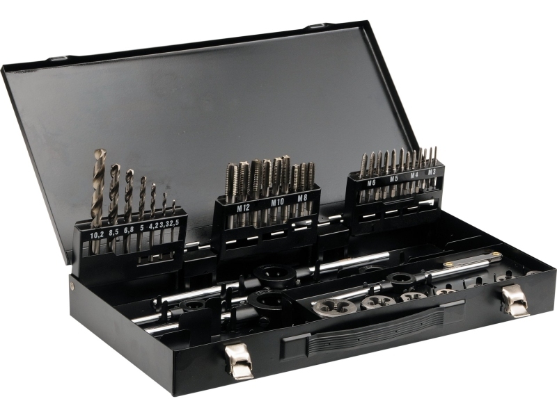 Setul de tarozi și matrițe este universal și se utilizează pentru tăierea atât a filetelor exterioare, cât și a celor interioare (de la M3 la M12).