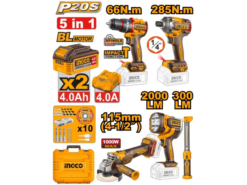 Set masina de insurubat+Polizor unghiular cu acumulator 20V 2*2Ah INDUSTRIAL INGCO CKLI20766