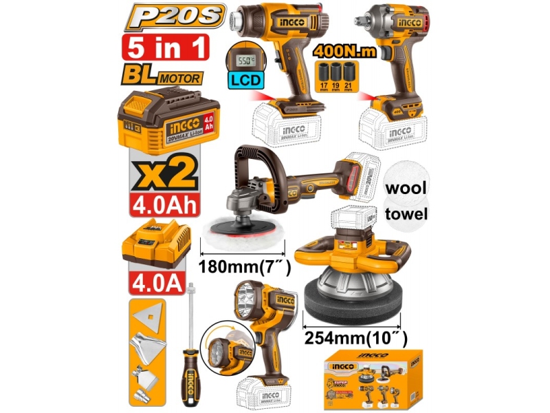 Set din 5 scule cu acumulator INDUSTRIAL INGCO COSLI250592 este alegerea perfectă pentru profesioniști și pasionații de bricolaj care doresc unelte puternice, versatile și fiabile într-un singur pachet. Acest set include:
