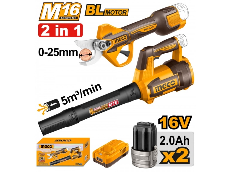 Set: Foarfecă pentru gradina + suflantă pe acumulator, 16V, 2 x 2.0Ah INGCO