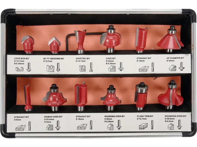 Un set de 12 cozi pentru prelucrarea lemnului. Frezele montate pe coadă au plăcuțe din carbură de tungsten YG6X cu diametrul de 8 mm. Setul include șase freze montate pe rulmenți pentru ghidarea ușoară a sculei. Frezele din argint brazat au o toleranță de 0,08 mm.