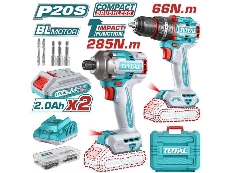 1 încărcător 20 V, 2 baterii Li-Ion de 2,0 Ah, 47 accesorii, 2 capete pentru șurubelniță, 3 capete pentru piulițe, cutie de plastic pentru transportarea sigură.