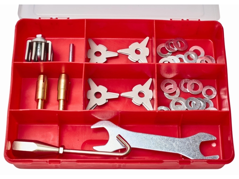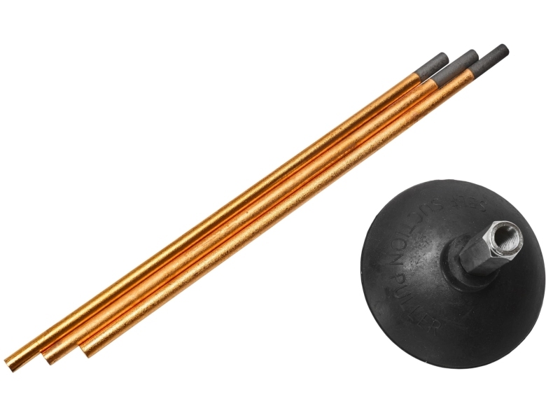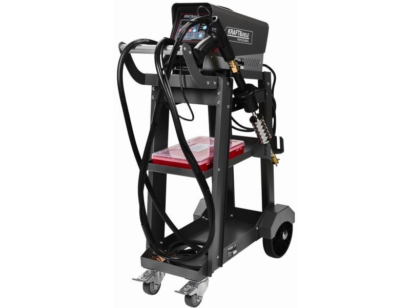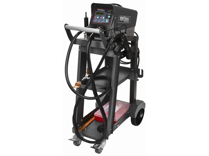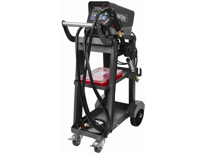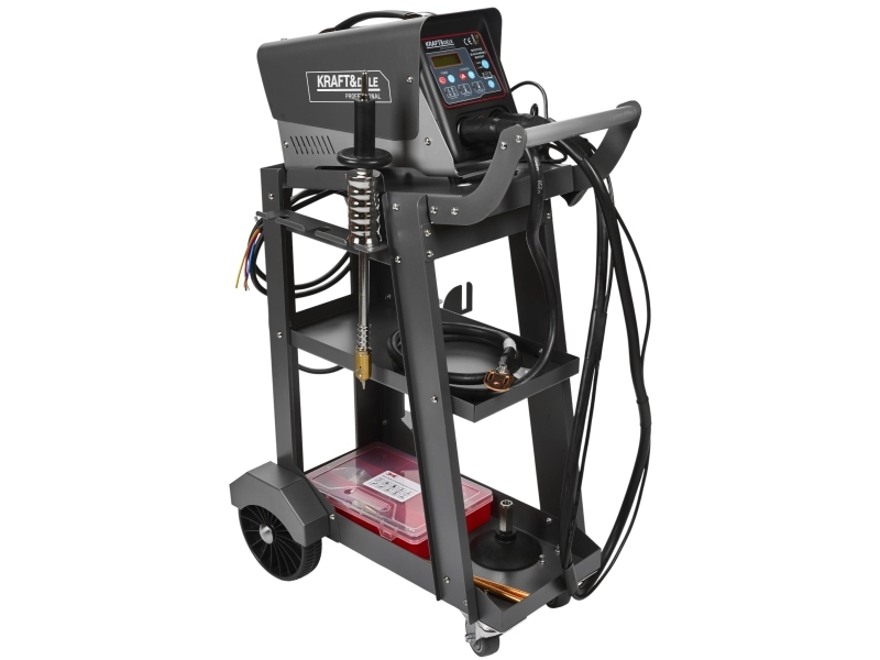 Устройство оснащено вакуумным ковшом грузоподъемностью 190 кг и устойчивой тележкой на четырех колесах, два из которых поворотные с тормозами, для легкого перемещения и надежного размещения в мастерской. Полный набор принадлежностей позволяет использовать споттер в полной мере для кузовного ремонта и работ с листовым металлом, включая сварку треугольными и стандартными шайбами, сварку болтов, резку угольным электродом, одностороннюю сварку, нагрев угольным электродом, сварку гофрированной проволокой, сварку контактными площадками и вакуумную присоску.