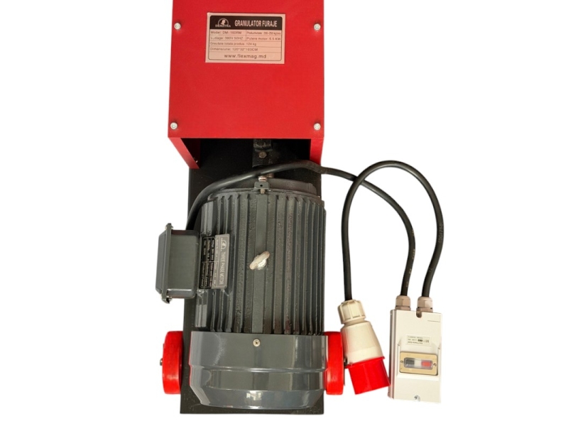 Трёхфазное питание 380 В ~ 50 Гц и двигатель мощностью 5.5 кВт с медной обмоткой обеспечивают стабильную, эффективную и долговечную работу даже при интенсивной эксплуатации. Производительность гранулятора составляет 200–250 кг/час, что делает его оптимальным решением для переработки измельчённых зёрен и кормовых смесей в качественные гранулы.