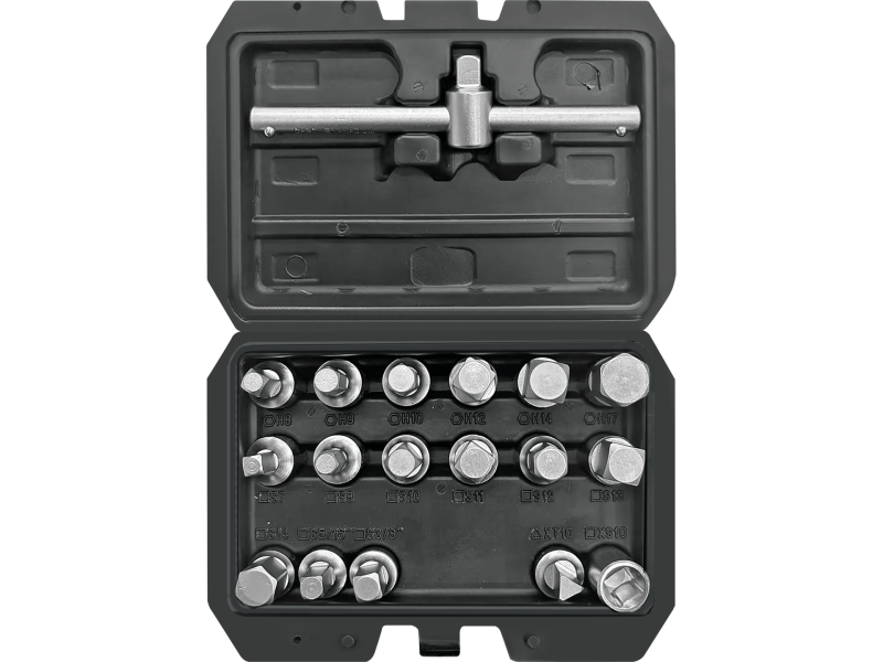 Набор торцевых ключей для пробки масляного поддона. Содержит следующие формы и размеры: шестигранные: 8; 9; 10; 12; 14; 17 мм; квадратные: 7; 8; 10; 11; 12; 13; 14 мм; 5/16"; 3/8"; треугольные: 10 мм