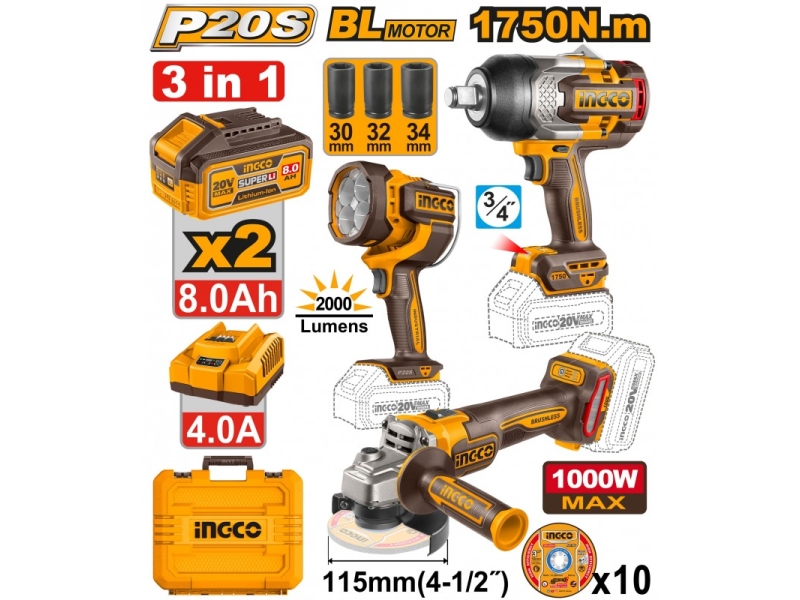 Набор из 3 аккумуляторных инструментов INDUSTRIAL INGCO COSLI250593 включает аккумуляторный ударный гайковёрт, аккумуляторную угловую шлифмашину и аккумуляторный светодиодный фонарь, обеспечивая комплексное решение для профессиональной работы по закручиванию, резке и освещению.