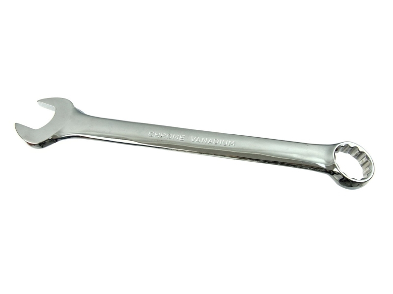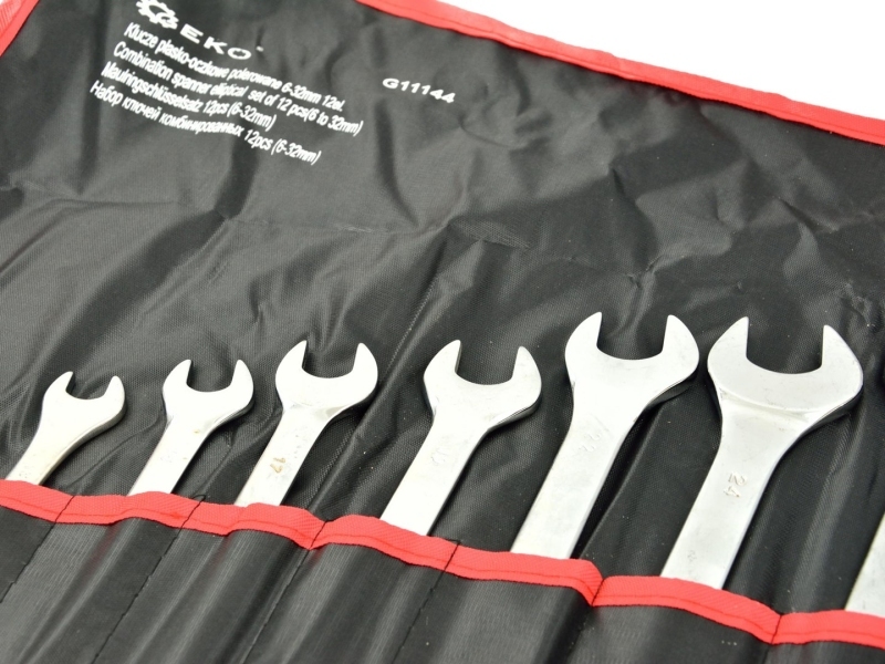 Набор из 12 полированных комбинированных ключей размером 6–32 мм. Ключи изготовлены из хром-ванадиевой стали (CrV). Они упакованы в прочный футляр с застежкой-липучкой Velcro, которую можно повесить на стену.