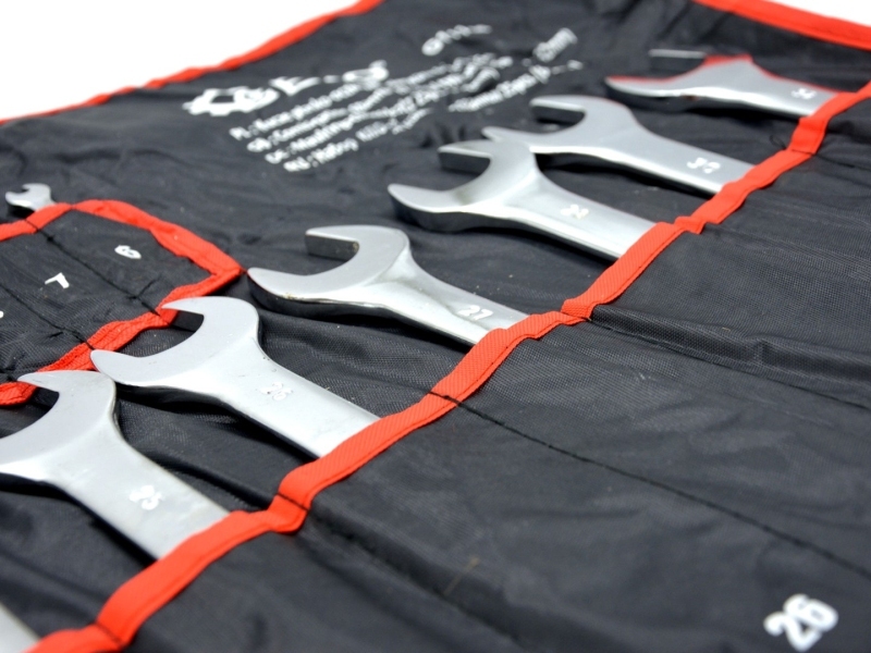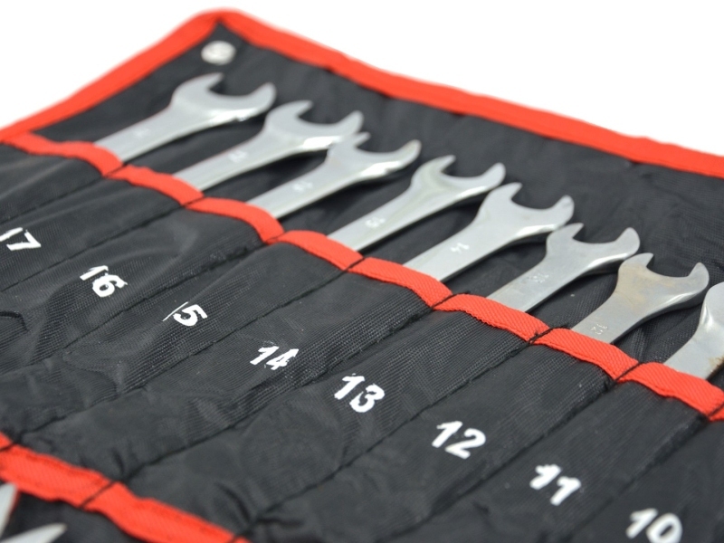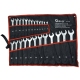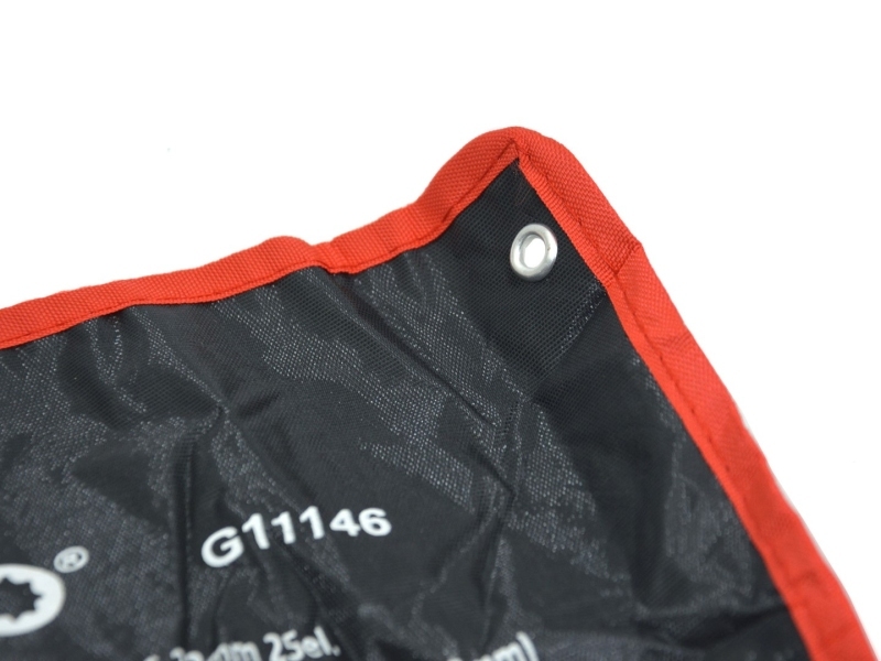 Набор из 25 полированных комбинированных ключей. Ключи изготовлены из хром-ванадиевой стали (CrV). Они упакованы в прочный футляр с застежкой-липучкой, который можно повесить на стену.