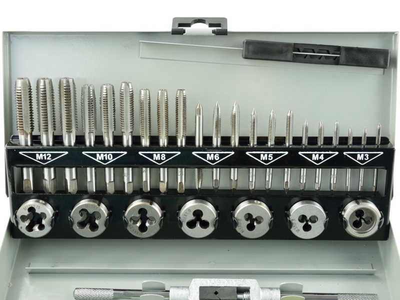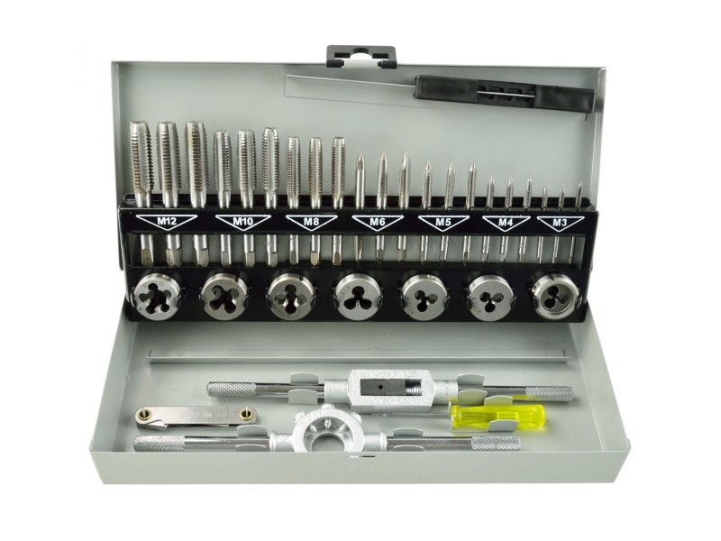 Современный набор метчиков и плашек М3 - М12. В набор входят 32 различных инструмента из высококачественной стали .