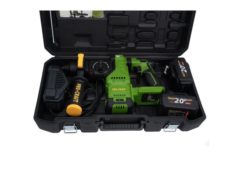 Аккумуляторный перфоратор Procraft PHA30 оснащен практичным кейсом и двумя мощными аккумуляторами, что делает его идеальным помощником для профессионалов и требовательных домашних мастеров