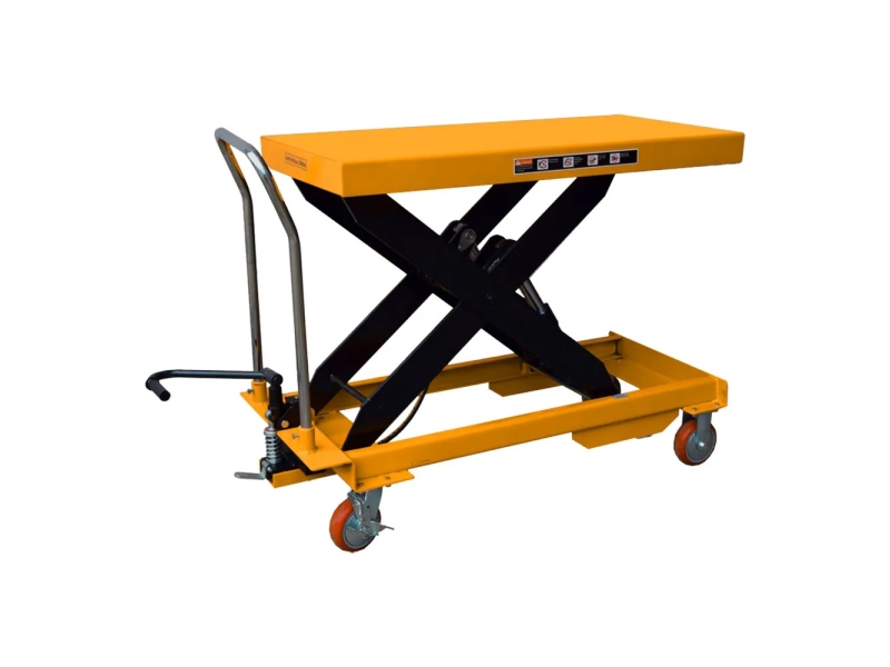Гидравлическая система подъема использует двойной насос с противообратным клапаном, с предохранительным клапаном, который предотвращает неконтролируемое падение, обеспечивая безопасное функционирование. Колеса (PU или нейлон, ~125 мм) оснащены ножным тормозом для стабильной фиксации во время работы.