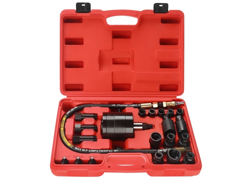 В комплект входят различные насадки и адаптеры, что позволяет использовать его с широким спектром форсунок различных производителей (Bosch, Delphi, Denso, Siemens).