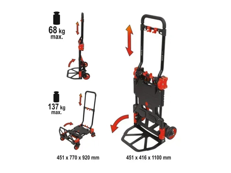 Складная складская тележка 2-в-1 YATO YG-37412 – может использоваться как платформенная тележка и как ручная тележка. В сложенном виде занимает мало места, что облегчает хранение и транспортировку самой тележки. Колеса из TPR не повреждают поверхность, по которой тележка движется. Выдвижная ручка заканчивается удобной пластиковой рукояткой.