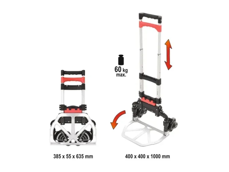 Эта складная тележка — идеальное решение для эффективной и безопасной перевозки предметов весом до 60 кг. Благодаря легкой алюминиевой конструкции и компактному дизайну, она идеально подходит для небольших помещений или мобильного использования. Платформа размером 39 x 28 см прочная и достаточно вместительная для коробок и предметов различного размера.