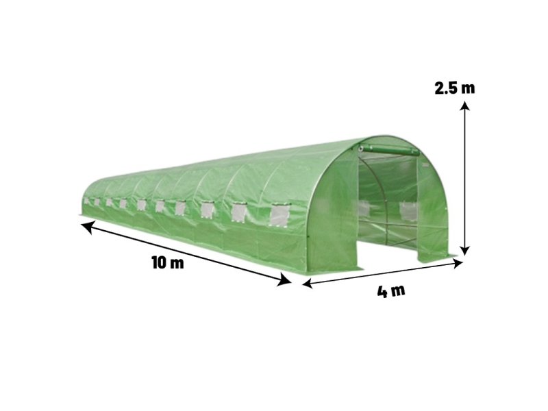 Благодаря увеличенным размерам — 10 м длина, 4 м ширина и 2.5 м высота, теплица подходит как для частных хозяйств, так и для небольших ферм. Две входные двери и боковые вентиляционные окна с защитной сеткой обеспечивают оптимальную циркуляцию воздуха и предотвращают перегрев даже в жаркие дни. Расстояние между дугами 1 метр обеспечивает равномерную нагрузку и устойчивость всей конструкции. Теплица поставляется в полном комплекте, что позволяет установить её легко и быстро — она полностью готова к использованию сразу после монтажа.