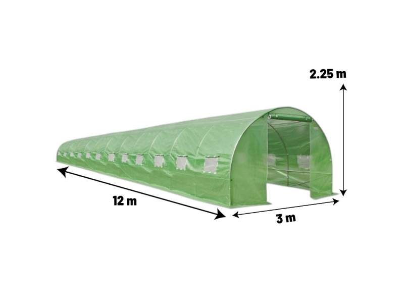 Благодаря увеличенным размерам — 12 м длина, 3 м ширина и 2.25 м высота, теплица подходит как для частных хозяйств, так и для небольших ферм. Две входные двери и боковые вентиляционные окна с защитной сеткой обеспечивают оптимальную циркуляцию воздуха и предотвращают перегрев даже в жаркие дни. Расстояние между дугами 1 метр обеспечивает равномерную нагрузку и устойчивость всей конструкции. Теплица поставляется в полном комплекте, что позволяет установить её легко и быстро — она полностью готова к использованию сразу после монтажа.