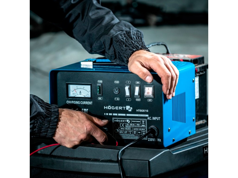 Зарядное устройство Hoegert HT8G616 - устройство для зарядки 12-24-вольтовых аккумуляторов мотоциклов, легковых автомобилей и микроавтобусов, жилых трейлеров, квадроциклов, моторных лодок, тракторов, а также садовой техники. Зарядное устройство позволяет заряжать серные и кислотные аккумуляторы (WET).