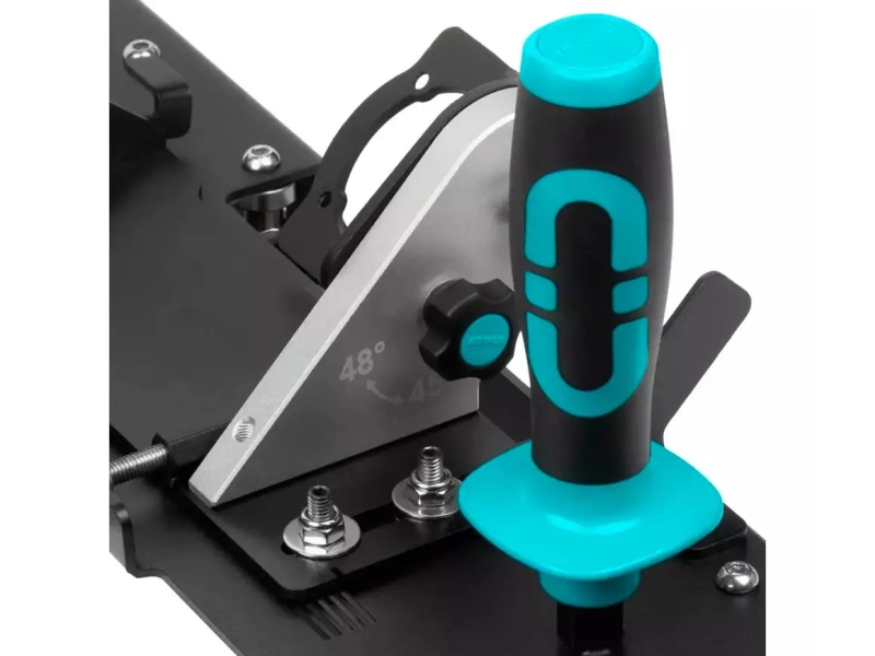 С помощью шкалы можно настроить размер заусовки в соответствии с вашими задачами. Режущий блок можно регулировать и наклонять от 45° до 48°, что обеспечивает гибкость в работе.